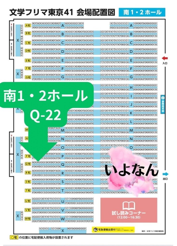 さて、今回の文フリ東京41は、11月23日(日)12:00~17:00 東京ビッグサイト南1-4ホールで開催される。今回から当日券は1500円。前売りは1000円なので注意。いよなんブースは南1・2ホールのQ-22である。
