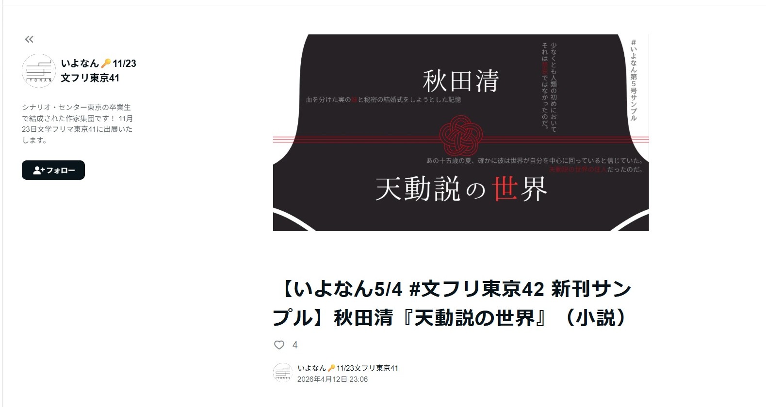 ほんの二年前には、僕は「文フリ」が何なのかも知らず、畏友Kに誘われて初めて見に行ったのだ。その時のことはこのブログの「『いよなん』のこと」(24年7月14日投稿)に書いている。この時の「文学フリマ東京38」で、畏友Kも加わっている「いよなん」の創刊号を買ったのだが、その後その仲間に入れてもらい2号から参加させてもらっているのだ。「小説」も約40年ぶりに書いた。